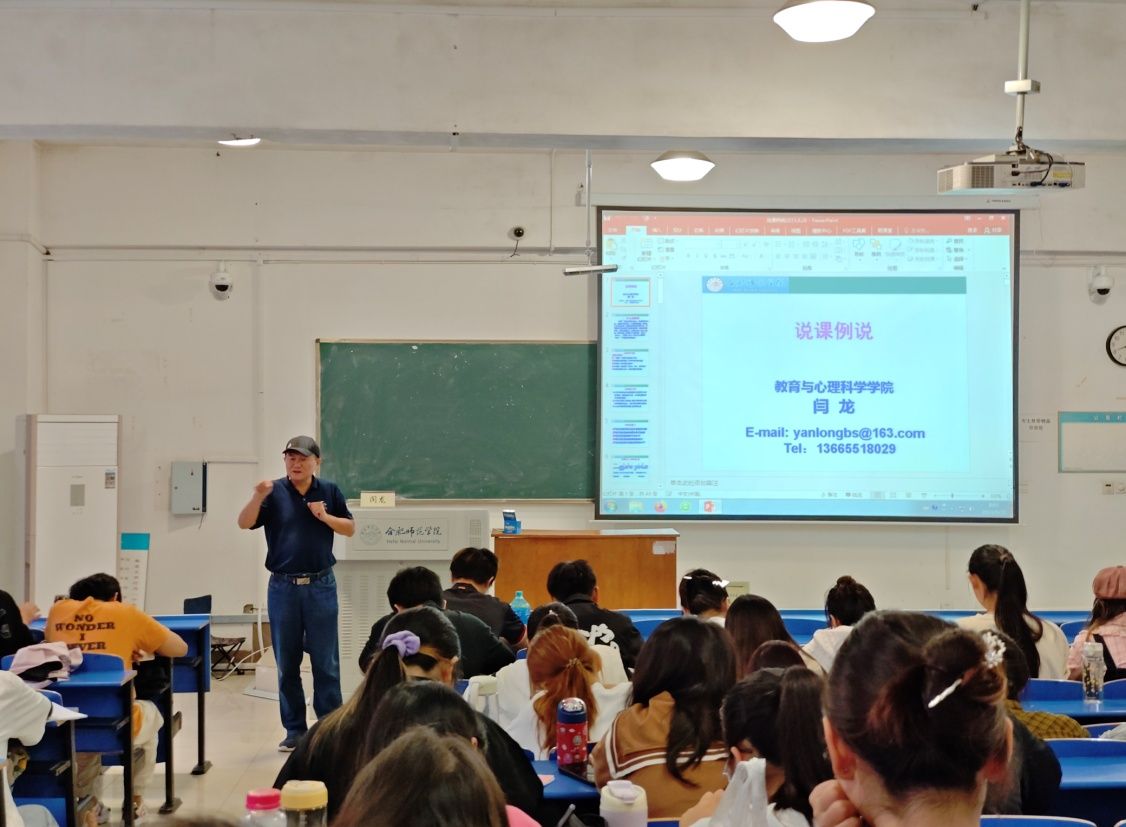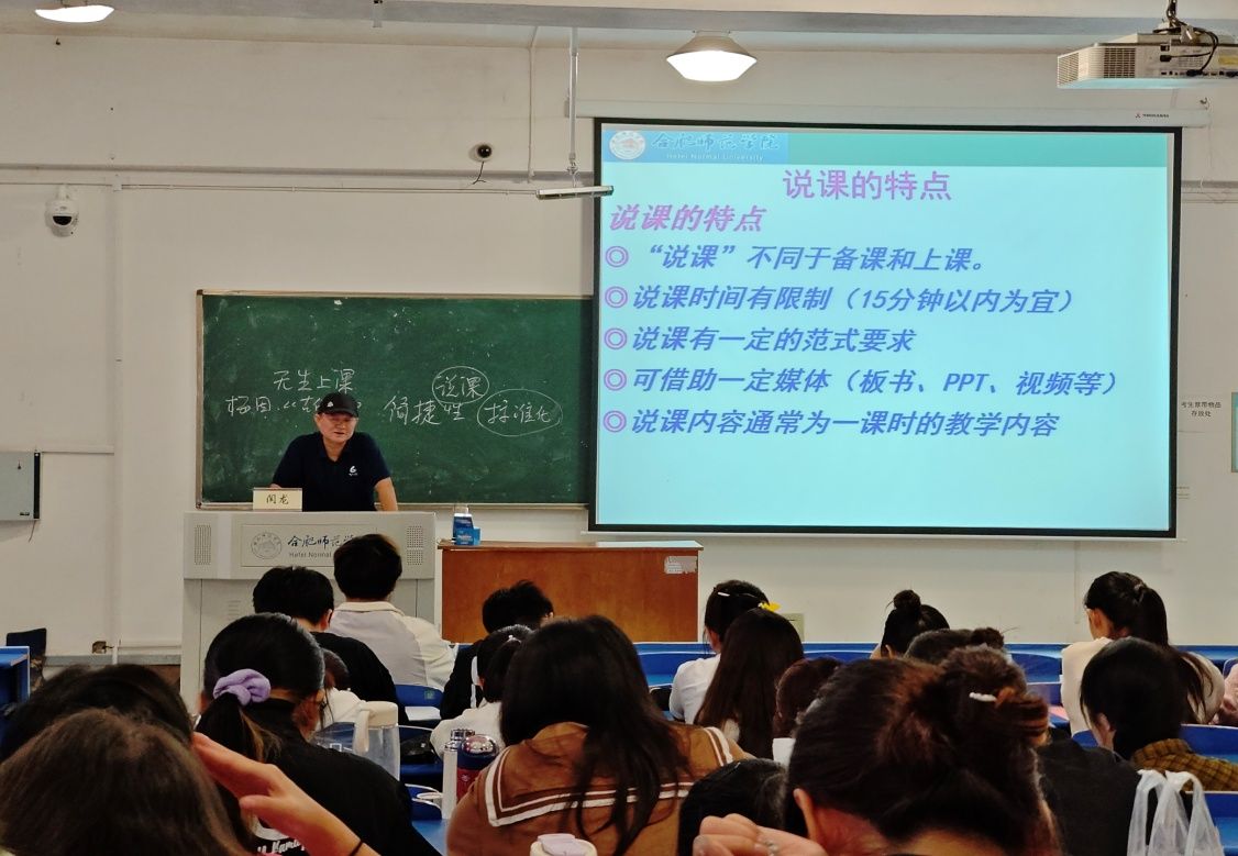 闫龙从“什么是说课”谈起,介绍了说课需要解决“教什么、怎么教、为什么这样教”三个维度的问题。他强调,“说课”是以讲述为主的教研活动,详细讲解了说课与上课、教案与说课稿、说课与备课的区别以及说课的注意事项等,让同学们清晰地认识了说课的正确形式。