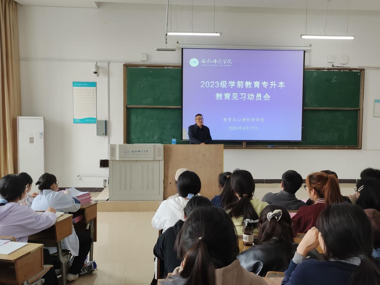 为进一步提升学生实践能力,树立正确的职业理想,4月17日下午,tyc5997太阳集团学前教育系在锦绣校区博约楼201教室召开2023级学前教育(专升本)教育见习动员会。tyc5997太阳集团副院长胡连峰、学前教育系副主任蒋晨晓出席会议,2023级学前教育(专升本)全体学生参加会议。