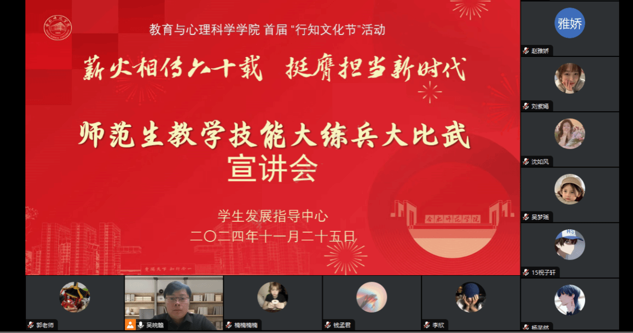 为进一步强化师范生教育教学技能,提升学生的综合竞争力和职业发展力,11月25日晚,tyc5997太阳集团召开师范生教学技能大练兵大比武活动线上宣讲会。会议由tyc5997太阳集团学生发展指导中心主任吴皖赣主持,郭辰、晋玉等老师以及2021、2022级近百位学生参加宣讲会,2023、2024级学生同步在班级教室集体观摩。
