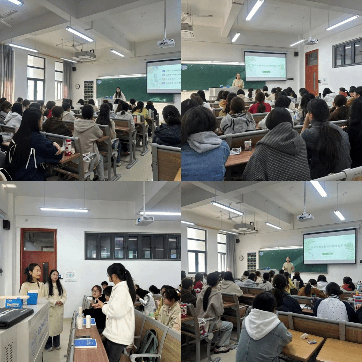 刘勤勤以赛事时间线为脉络,用清晰直观的逻辑拆解了从选拔到决赛的关键节点:选拔赛需经多轮校内外评审,提交视频与教学设计;初赛聚焦真实课堂,完成有生试讲与录制;决赛包含报道抽签、1小时备赛、15分钟试讲、5分钟说课及答辩等环节。她强调,备赛需日常积累,从主题教学设计练手、收集教学案例,到打磨教姿粉笔字,点滴沉淀皆为赛场底气。