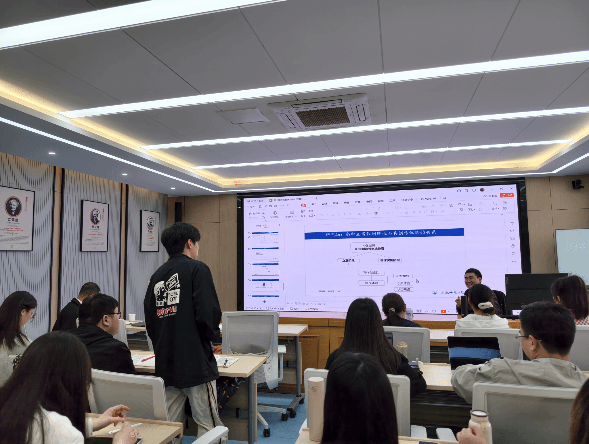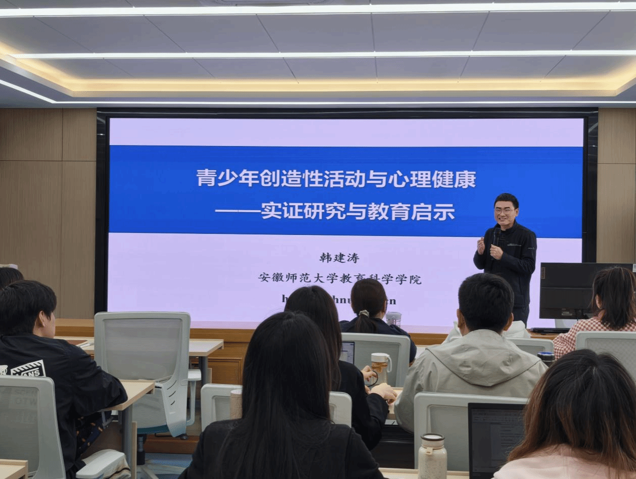 讲座中,韩建涛教授以社会需求与国家政策为切入点,系统阐释创造性与心理健康的内涵及其关系,结合创造力5A构型模型与塞利格曼幸福模型等理论,依托四个系列实证研究成果,深入揭示创造性活动在促进青少年心理健康与提升幸福感中的作用机制;同时,围绕心理健康教育专业的科研写作与学术研究方法,凝练提出贯穿选题至结论的六个关键意识——问题意识、理论意识、细节意识、呼应意识、对比意识与联系意识,为心理健康教育专业研究生及应用心理学本科生开展规范化、高质量实证研究提供了清晰路径与方法指引。