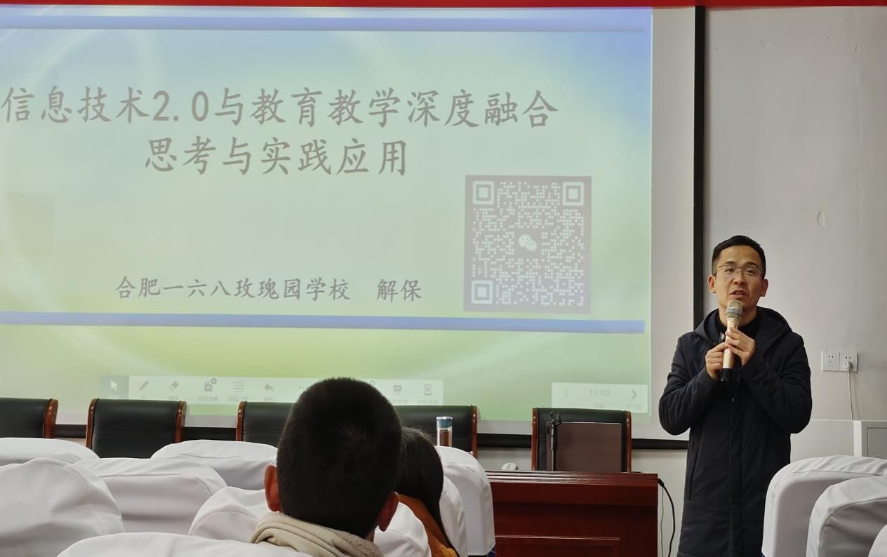 接着,合肥一六八玫瑰园学校胡春阳老师为学员们开展了“《教师数字素养》标准解读”的讲座。两个小时的时间悄悄流淌,胡老师的讲座如沐春风,给寒冷的冬天带来阵阵暖意。胡老师长期深耕在教育一线,他深知在数字化、信息化的时代,不能用昨天的老办法教今天的新学生。他从数字化素养标准进行解读,对数字化意识、意愿、意志、社会责任等几个方面做了深刻阐述,尤其在应用方面,胡老师用理论联系实际,用通俗的语言、生动的案例、一手的数据让老师们知道如何利用教学资源解决教育教学中的实际问题。他号召全体老师要紧跟时代步伐,结合工作实际努力提升个人数字化教学能力,构建智慧课堂,同时积极以研促教,积极参加教育教学信息化大赛,通过各种活动、比赛提升自身的应用能力。通过此次讲座,老师们切实感受到信息化教学的魅力及当代教师信息能力提高的急切需求。
