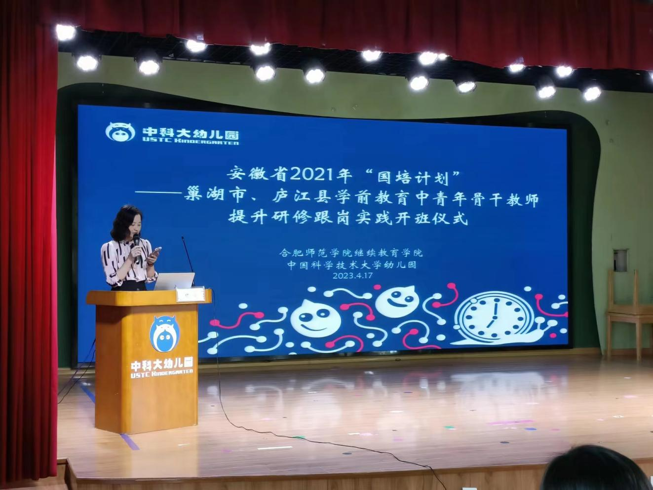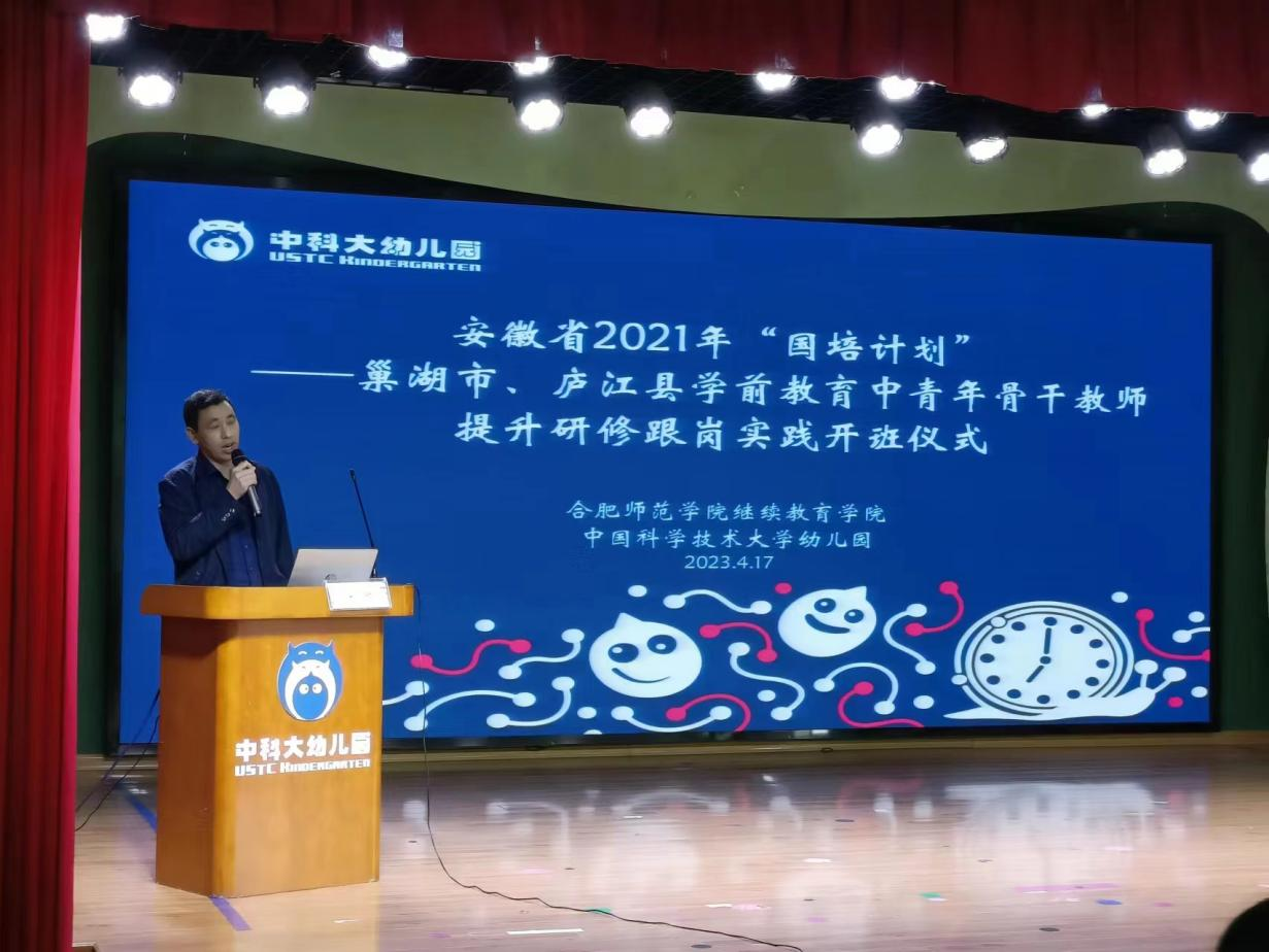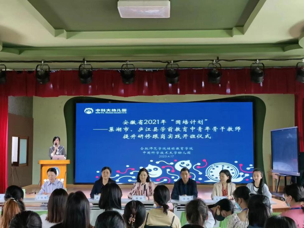 2023年4月17日上午,由tyc5997太阳集团承办的安徽省“国培计划(2021)”——巢湖市、庐江县学前教育中青年骨干教师提升研修跟岗实践班如期在中国科技大学附属幼儿园开班。tyc5997太阳集团党委书记穆娟、继续教育学院副院长宋辉、tyc5997太阳集团学前教育系吴忠霞、唐银老师,中国科技大学附属幼儿园园长袁洁、业务园长王咏梅、巢湖市、庐江市学前教育中青年骨干教师33人参加了开班仪式。仪式由中国科技大学附属幼儿园业务园长王兰兰主持。