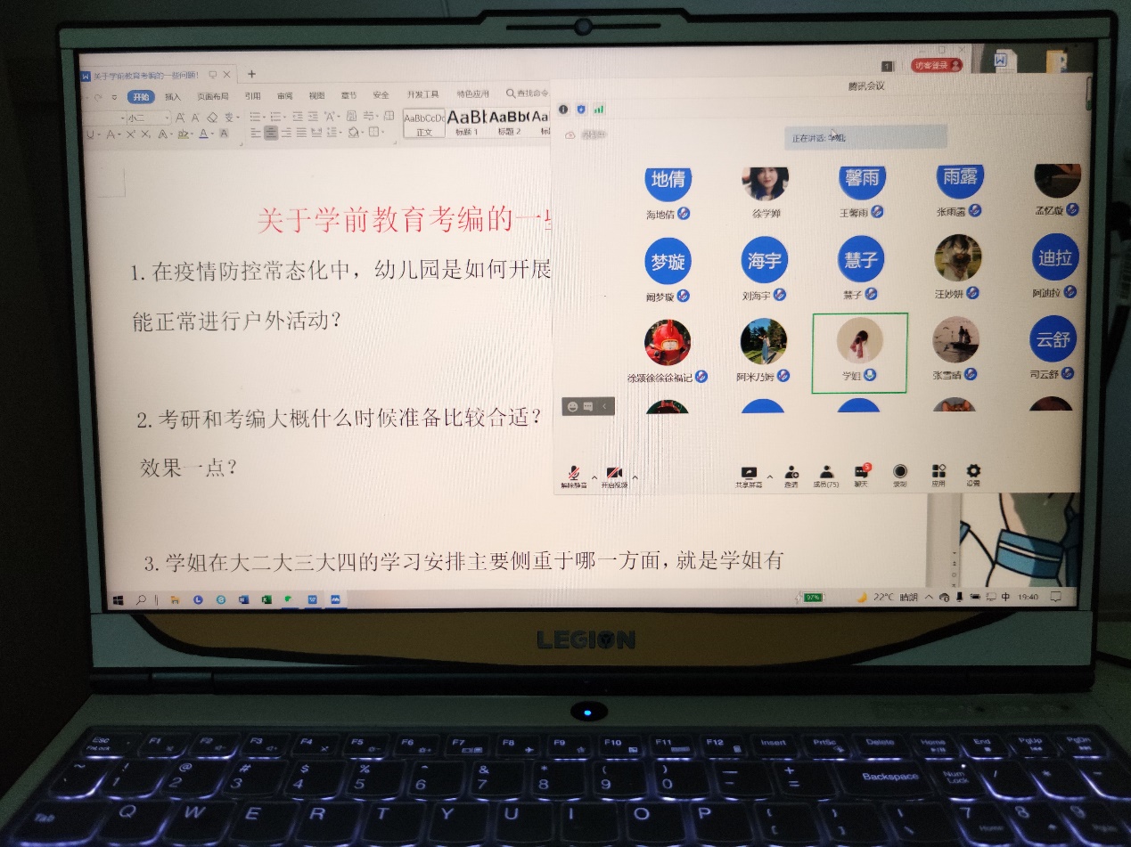 为深入了解学前教育发展现状,激发学生专业学习的主动性与积极性,经教师教育学院领导邀请,2019届学前教育班毕业生蒋丽于9月23日晚上通过网络视频会议的方式,用了一个半小时的时间为2020级学前教育本科班学生做了一场精彩的专业发展指导交流会。