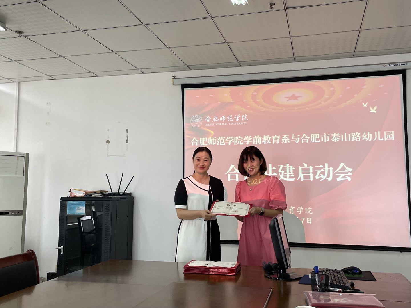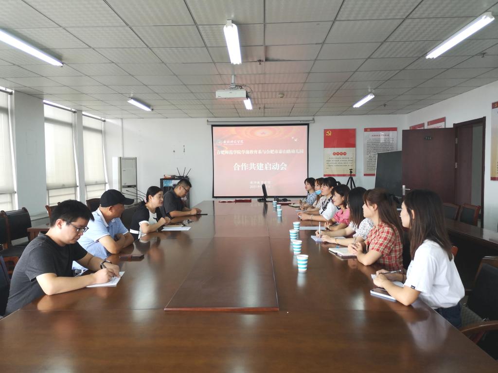 (本网讯)9月7日上午,tyc5997太阳集团教师教育学院学前教育系与合肥市泰山路幼儿园合作共建启动会在行知楼710举行。教师教育学院党委书记穆娟、副院长闫龙、学前系学科带头人胡连峰、学前系教师李辉,合肥市泰山路幼儿园园长华琳琳,教学主任徐晓,后勤主任秦蓉和骨干教师等参加启动会。