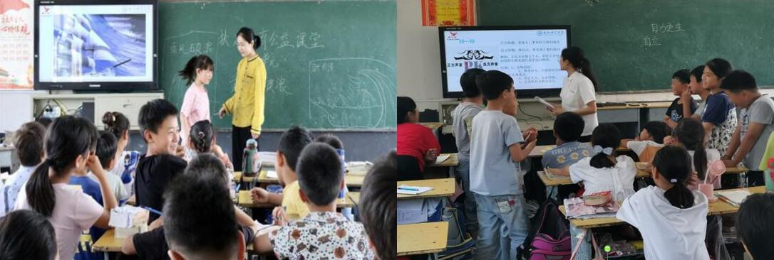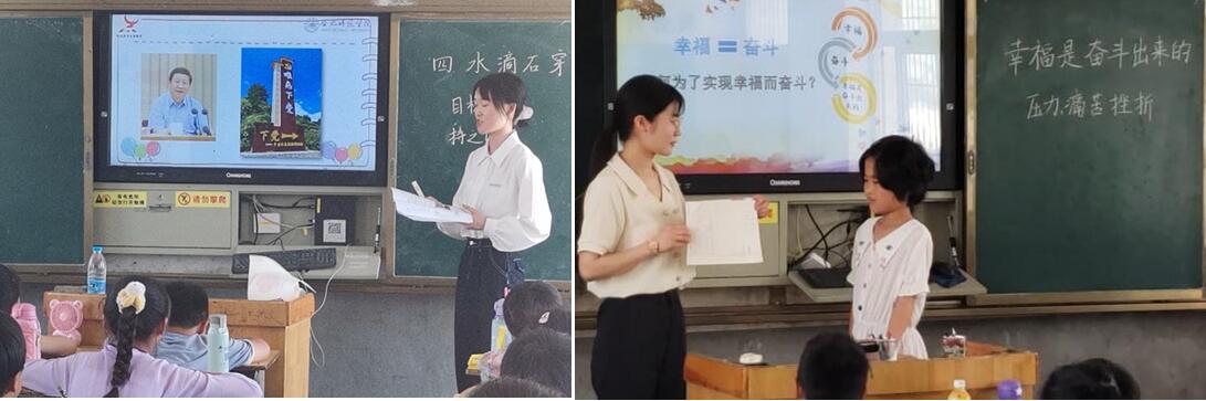 在课堂上,教师教育学院的6位“小先生”分别围绕脱贫攻坚是干出来的、幸福是奋斗出来的、滴水穿石、弱鸟先飞、自力更生、乘风破浪等6个主题,用故事、多媒体等呈现方式以及生动易懂的语言,激发孩子们树立远大志向和高远理想。课堂气氛活跃,互动融洽热烈,“小先生”们激情投入,听课的孩子聚精会神。在这些“小先生”的启发引导下,两所小学的孩子们用稚嫩的笔触、以或写或画的方式展示出了对未来美好生活的憧憬。