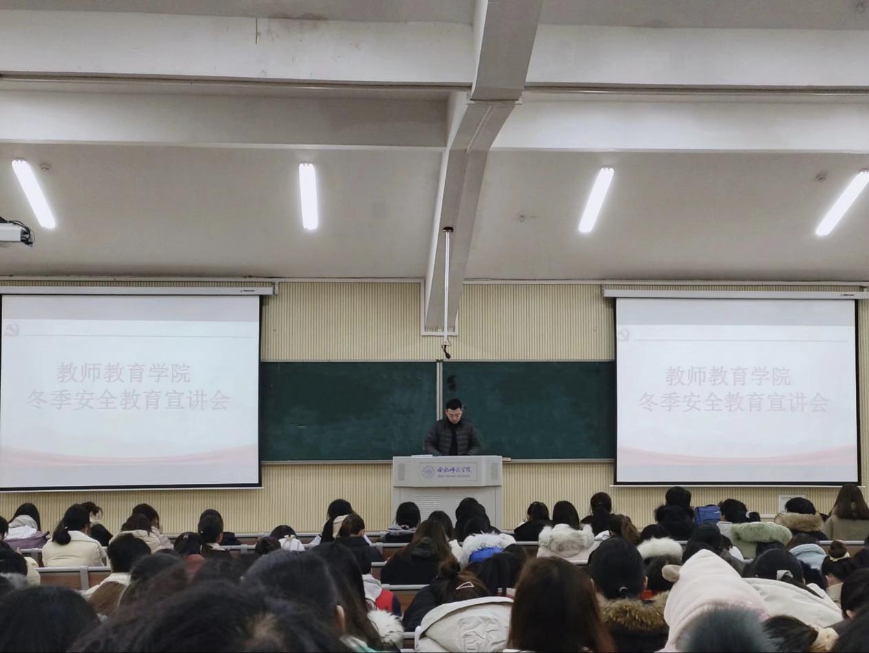 为进一步落实疫情常态化防控、做好学生的冬季安全教育,提高学生安全防范意识和自我保护能力,按照教师教育学院党委统一部署,12月教师教育学院陆续在三孝口、锦绣和滨湖校区开展了冬季安全教育工作。14日,滨湖校区学生冬季安全教育会在刘铭传教学楼A101教室如期举办,该院滨湖校区2019级和2020级全体学生参会,教师教育学院辅导员王磊、唐淼老师参加并主持了会议。