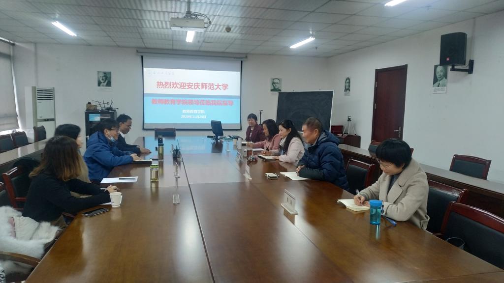 2020年11月25日上午,安庆师范大学教师教育学院党委副书记许世平、小学教育专业负责人李义胜、小学教育专业王爱菊教授和赵雪微老师,深入学校教师教育学院调研指导小学教育专业建设等问题,会议在锦绣校区行知楼710会议室召开。教师教育学院院长李群、书记穆娟、副院长闫龙、小学教育系系主任汪昌华及小学教育系部分教师参加了会议,会议由教师教育学院副院长闫龙主持。