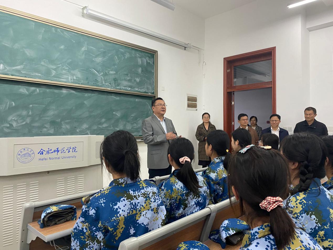 教师教育学院的新生以经久不息的掌声欢迎徐书记一行人的到来。“军训中的合师青年是一道亮丽的风景线。”徐成钢书记看到同学们挺拔的坐姿、整齐的着装、认真的态度,感叹道:“tyc5997太阳集团又注入了一股新生力量”。他祝贺同学们迎来了一个崭新的人生阶段,军训是大学生涯中最值得珍惜和回忆的。通过军训,同学们不仅能学到国防知识,还能学习到人民解放军艰苦奋斗、吃苦耐劳,爱国奉献、不怕牺牲,勇敢顽强、坚韧不拔的优良革命传统。