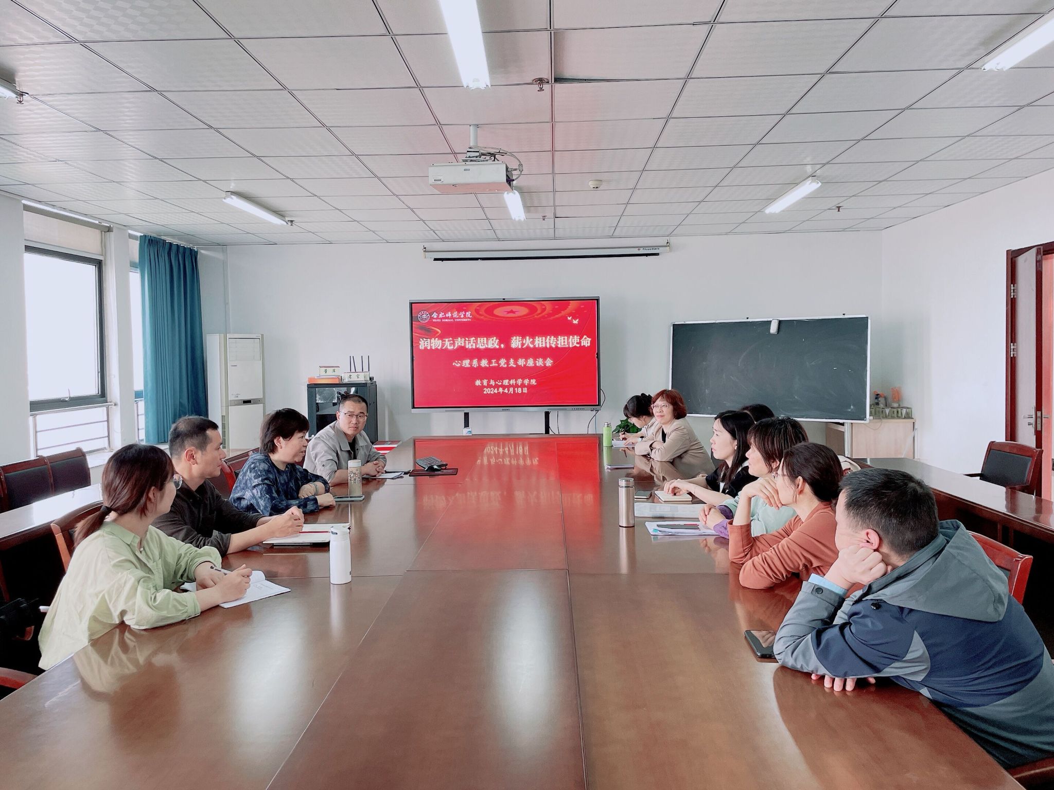 4月18日下午,tyc5997太阳集团心理系教工党支部在锦绣校区行知楼710会议室召开“润物无声话思政,薪火相传担使命”主题座谈会。本次座谈会邀请即将荣休的李群教授主讲,心理系教工党支部全体党员参加会议,部分非党员教师列席会议,座谈会由支部书记黄凤主持。