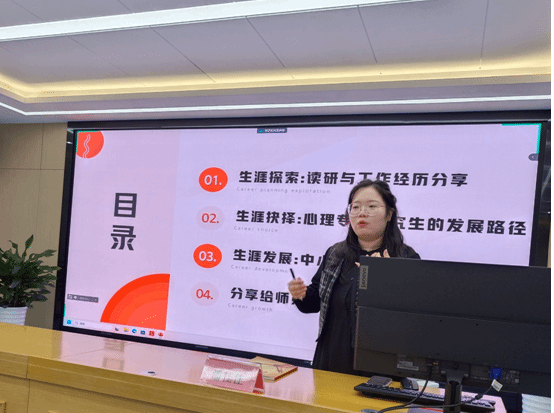中国科学技术大学附属中学潘佳佳老师为同学们作《中小学心理教师的职业生涯规划与专业成长》入学教育讲座,她结合自身学习、工作的经验,从生涯探索、生涯抉择、生涯发展三个方面分享了作为一名专业的心理教师的职业发展路径,引导研究生们关注身心健康、心态调整、目标规划、专注成长,助力新入学的心理健康教育硕士探索一条适合自身职业成长和专业发展的路径。