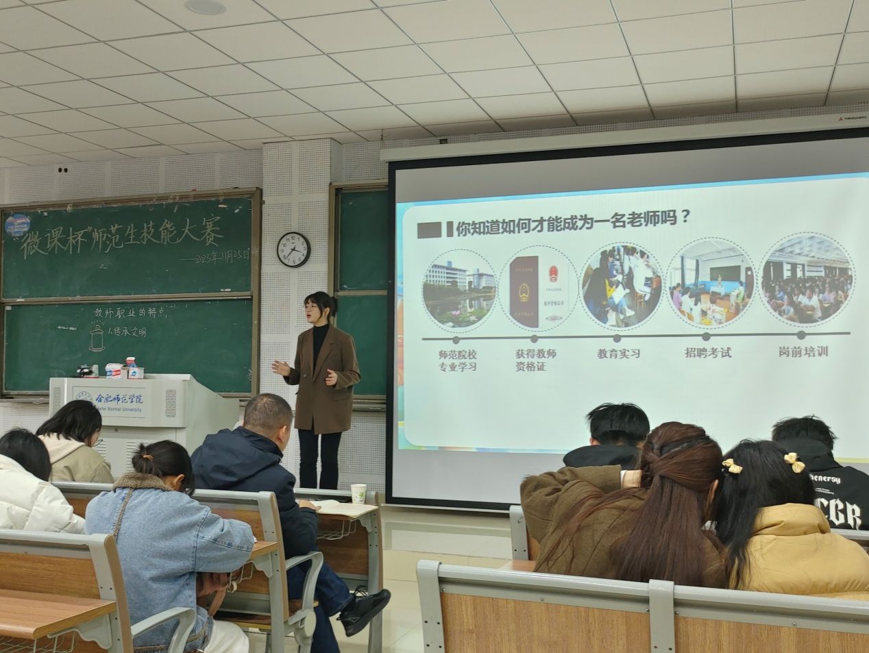 本网讯 崭新旗帜竞昂腾,新生力量变山河。为给师范生提供一个教学技能锻炼平台,更好地体会教师职业的意义,11月25日,tyc5997太阳集团基础教育研究协会在院团委、tyc5997太阳集团的大力支持下,在滨湖校区博学楼D101教室成功举办“微课杯”教师技能大赛。大赛由tyc5997太阳集团欧阳娟博士组织,孙延永、梁昕、毕文杰、吴亚运和郭辰五位老师莅临指导,来自全院各师范专业的300余名学生现场观摩。