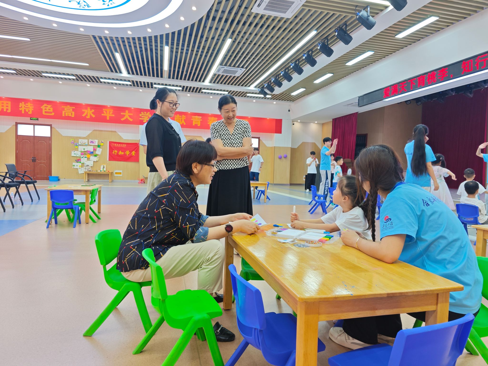 随后,方东玲俯身与小学员们亲切交谈,询问他们的学习感受和收获。她笑容可掬地鼓励孩子们要珍惜在行知学堂的学习时光,认真听讲、积极参与,不仅要学习知识,更要学会合作、懂得感恩,在轻松愉快的氛围中度过一个安全充实、快乐向上的暑假。