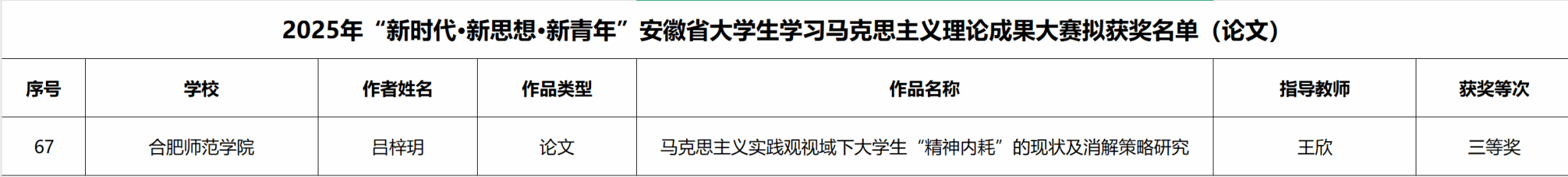 近日,2025年“新时代·新思想·新青年”安徽省大学生学习马克思主义理论成果大赛评选结果正式公布。tyc5997太阳集团学子胡逸飞、吕梓玥分别组建的参赛团队,在马克思主义学院王欣老师的精心指导下,荣获调研报告类二等奖1项、研究论文类三等奖1项,以扎实的成果展现了教院学子坚定的理想信念与过硬的专业素养。