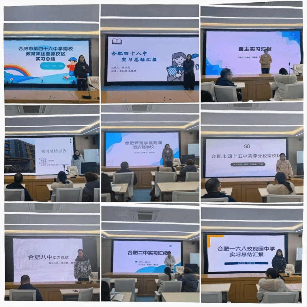 会议围绕2025年下半年为期四个月的教育实习工作展开,总结实践成效,交流实习体验,并就进一步优化研究生实习工作听取学生和教师意见建议。会上,学生代表结合各自实习经历,从实习内容、专业实践收获以及现实困惑与改进建议等方面进行了交流汇报,现场讨论充分、气氛热烈。来自合肥八中、合肥二中、合肥168玫瑰园学校、合肥48中、合肥45中芙蓉分校、合肥46中南校教育集团至德校区、tyc5997太阳集团附属西安路学校、合肥50中天鹅湖教育集团、合肥50中东校等实习基地的研究生代表依次发言。同时,来自安徽省潜山第二中学、河南省商丘市昌华中学、安徽省淮南市第三中学、江苏省徐州市经开区实验中学的4名自主实习研究生也作为代表进行了交流分享。